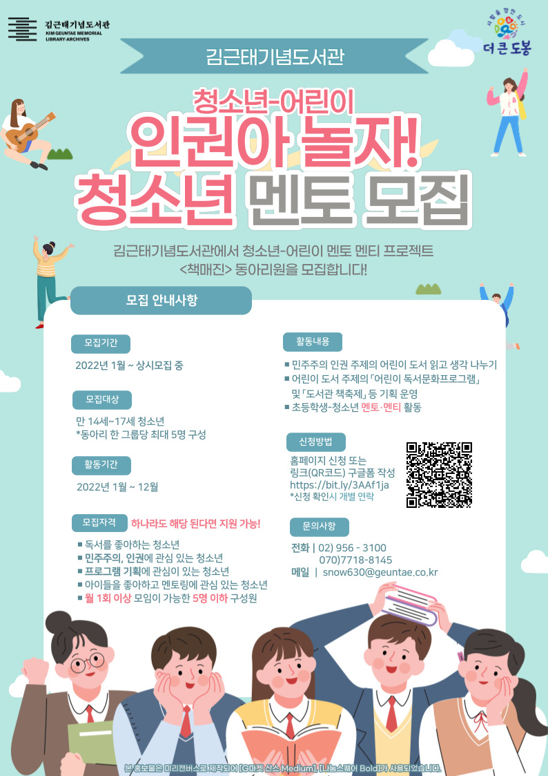 김근태기념도서관에서 청소년-어린이'인권아 놀자' 멘토-멘티 프로젝트 <책매진>동아리원을 모집합니다~^^