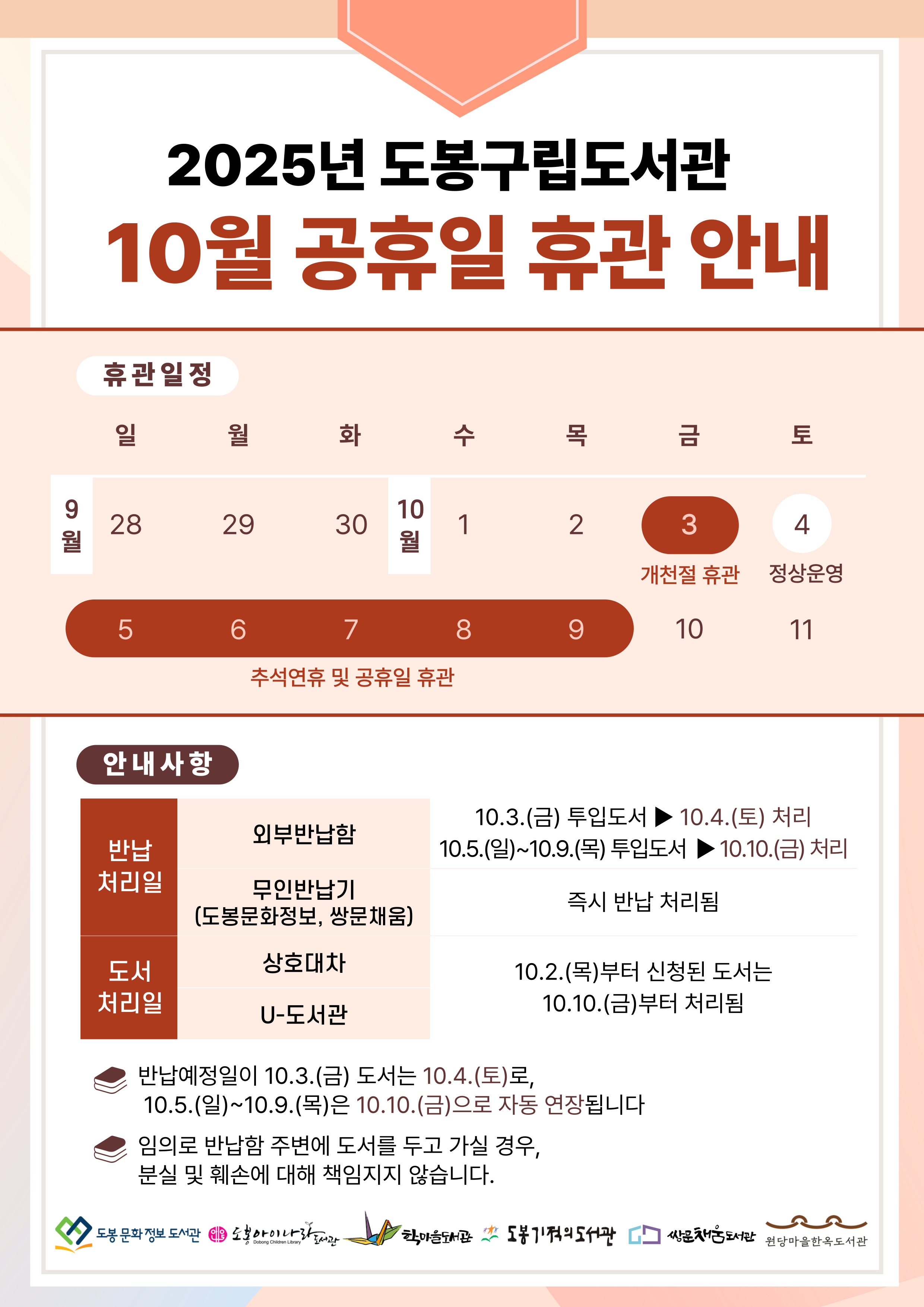 2025년 도봉구립도서관 10월 공휴일 휴관 안내
