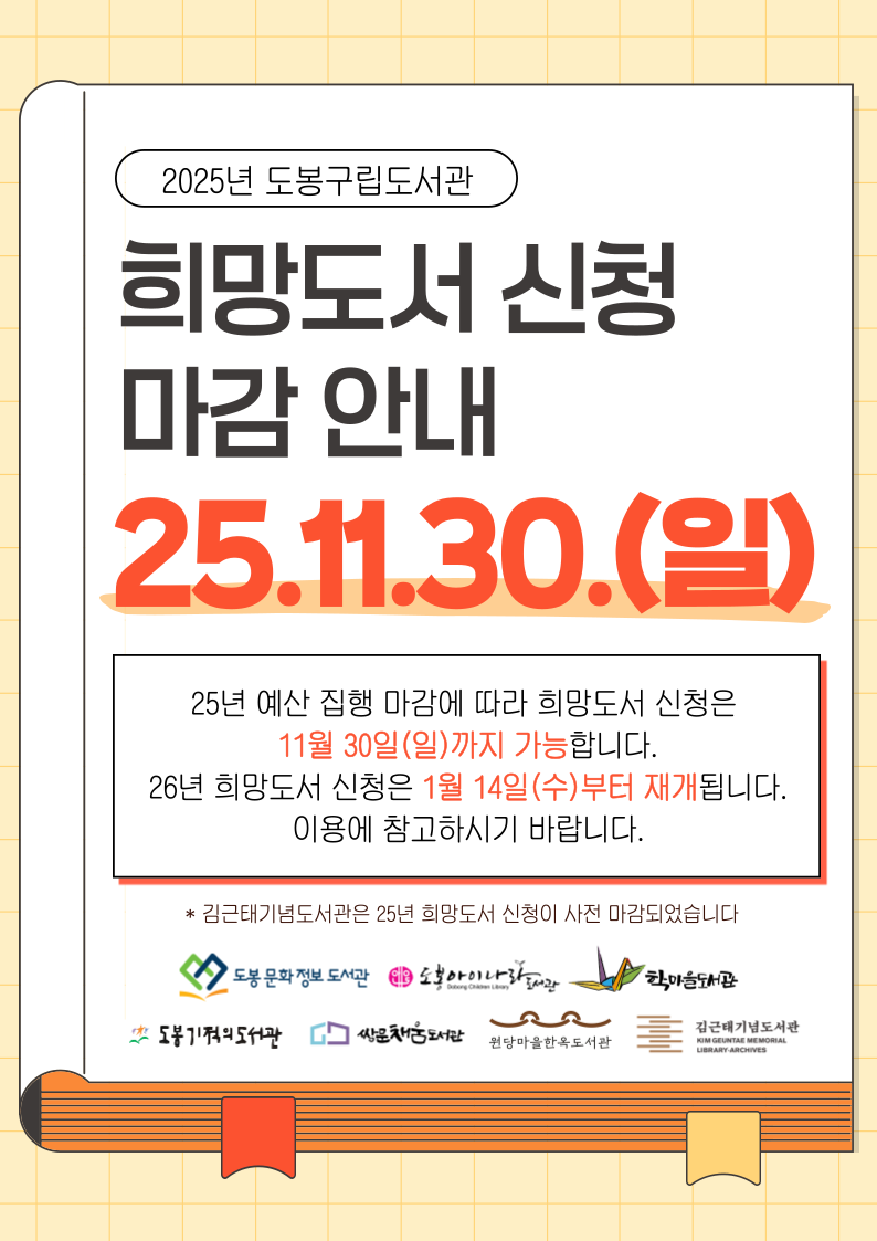 25년 예산 집행 마감에 따라 희망도서 신청은 11월 30일(일)까지 가능합니다.