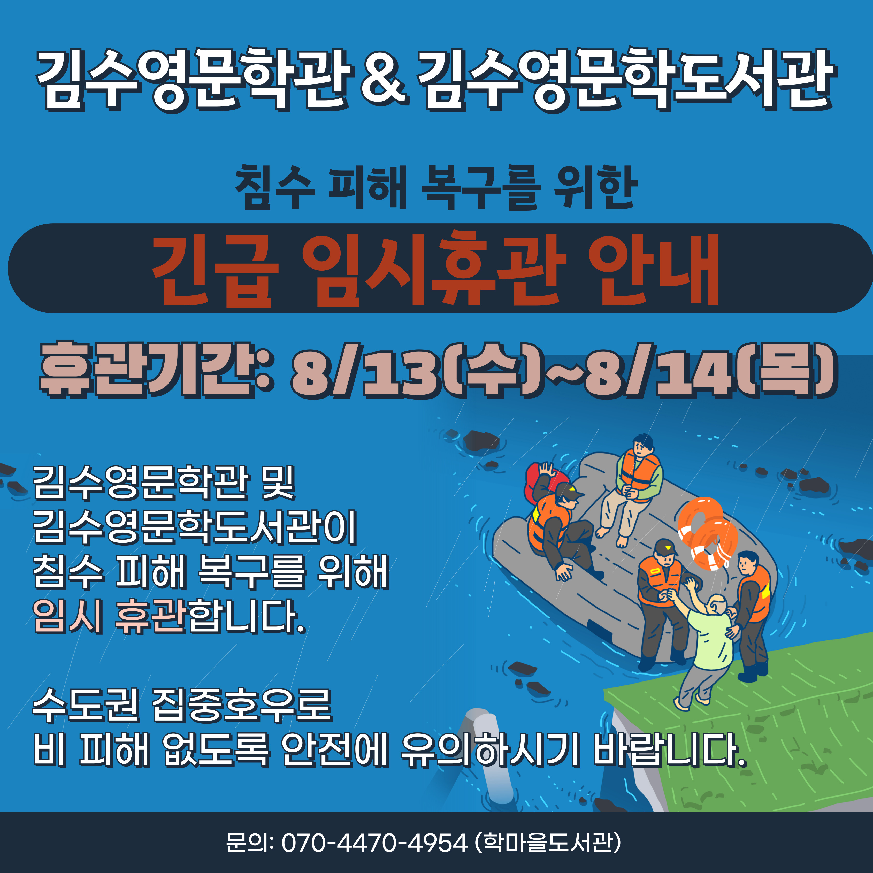 김수영문학도서관 임시 휴관 안내 - 기간: 8/13(수)~8/14(목) 김수영문학도서관이 침수 피해 복구를 위해 위 기간동안 임시 휴관합니다. 모두의 안전을 위함이니 양해 부탁드리며, 수도권 집중호우로 인한 비 피해 없도록 안전에 유의하시기 바랍니다. 문의: 070-4470-4954