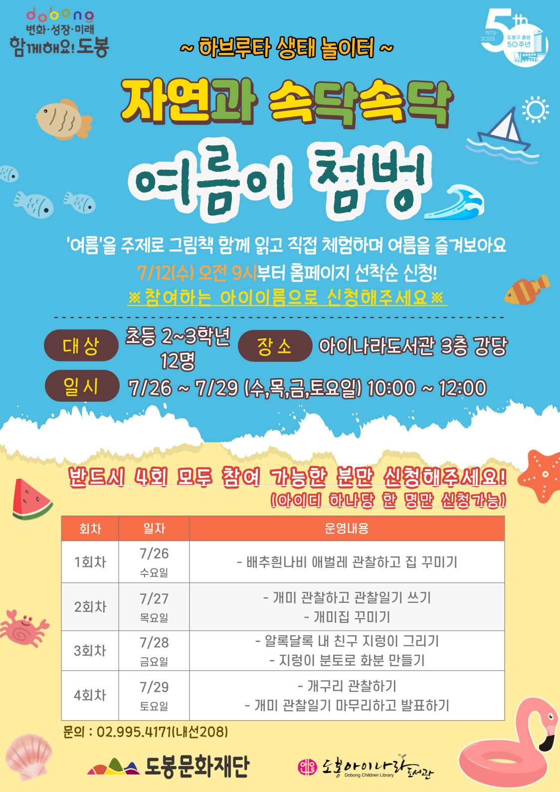 접수 : 7/12(수) 오전 9시부터 [도봉구통합도서관 홈페이지 > 독서문화프로그램 > 도봉아이나라도서관] 에서 신청 가능합니다