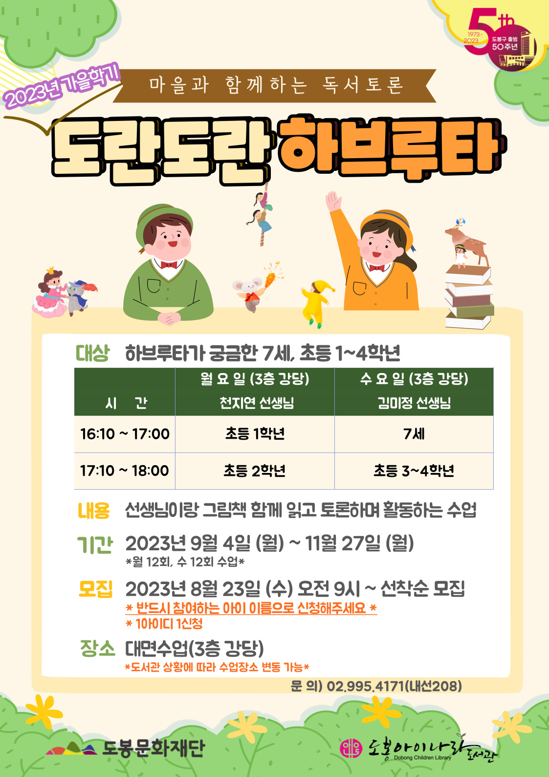 - 2023.8.23 (수) 오전 9시부터 도봉구통합도서관>독서문화프로그램>도봉아이나라도서관>각 연령 별 신청 페이지 에서 신청 가능합니다!