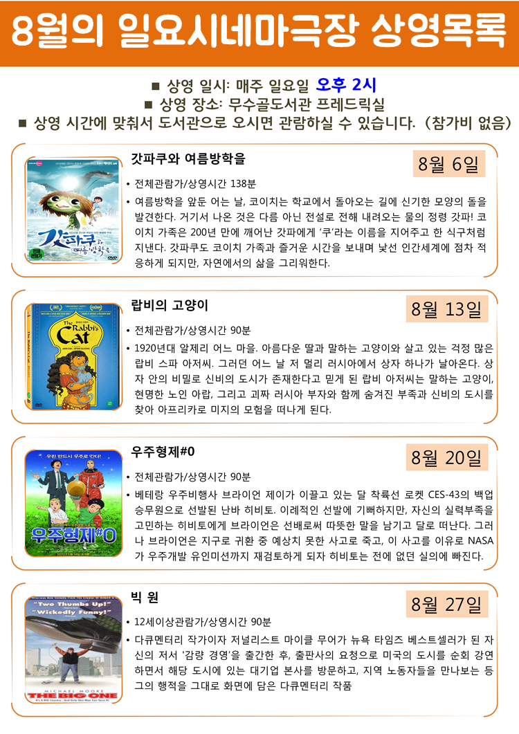 8월부터 상영시간이 오전 10시에서 오후 2시로 변경되었습니다. 많은 참여 부탁드립니다.