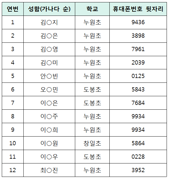 ※이○후(도봉초 6) 어린이 : 연락처가 부정확하여 연락이 어려워 신청 취소되었습니다.