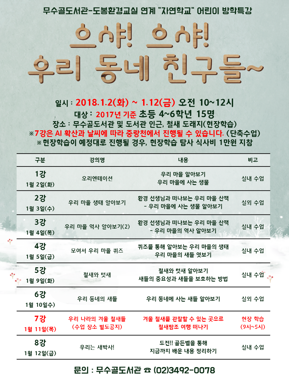 ※ 7강은 AI(조류독감) 확산 추이와 한파 여부에 따라 실외 수업(중랑천)으로 대체될 수 있습니다.