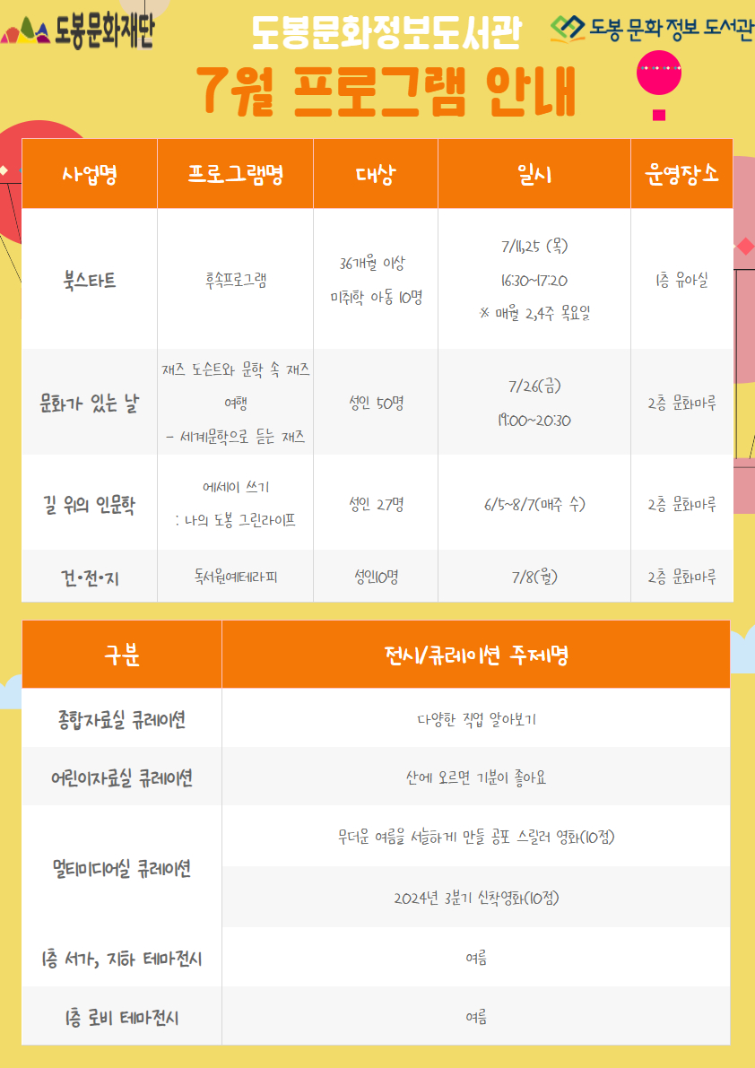 7월 도봉문화정보도서관 휴관일과 프로그램을 안내 드립니다. 많은 이용 부탁드립니다.