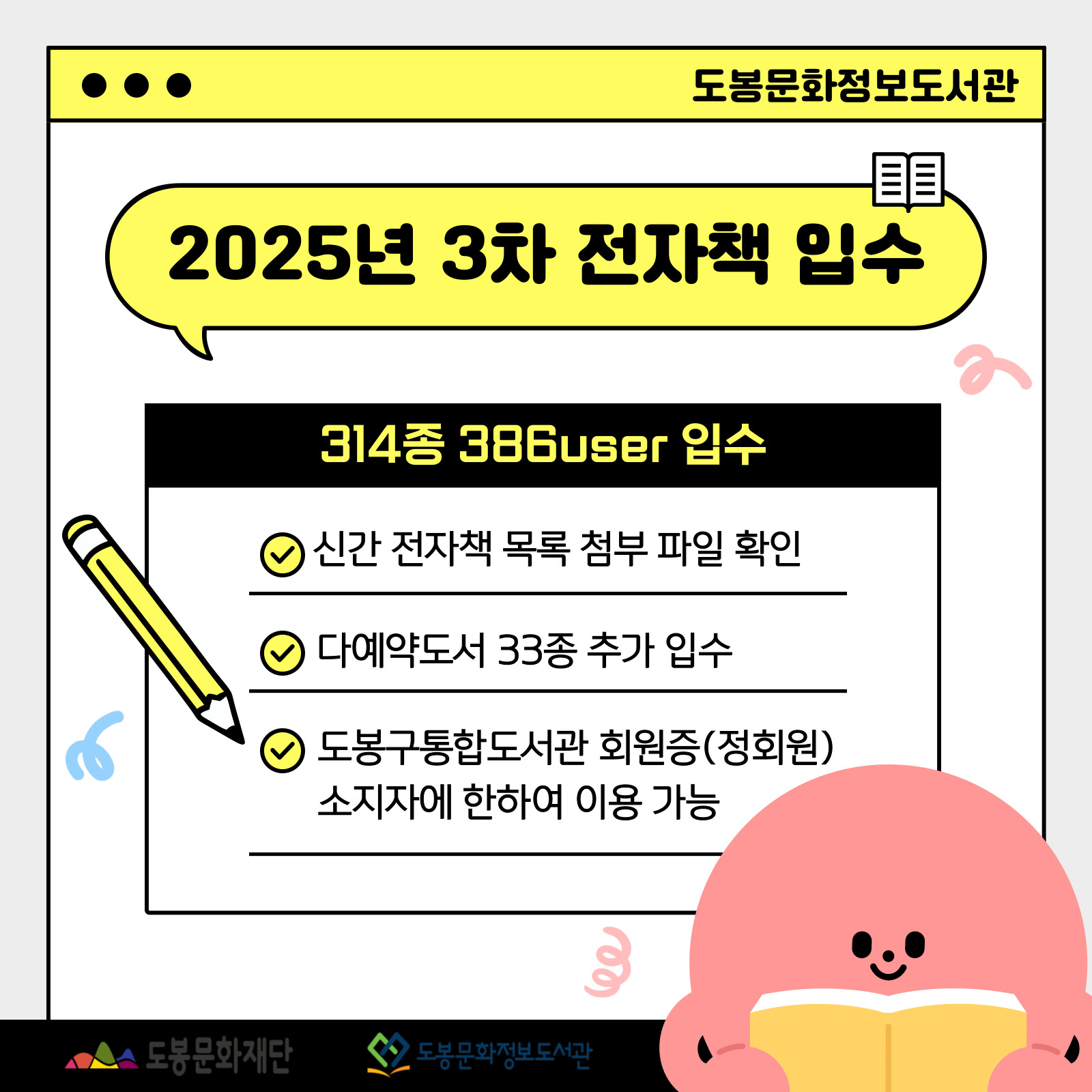 도봉문화정보도서관 2025년 3차 전자책 314종(386user)이 입수되었습니다.