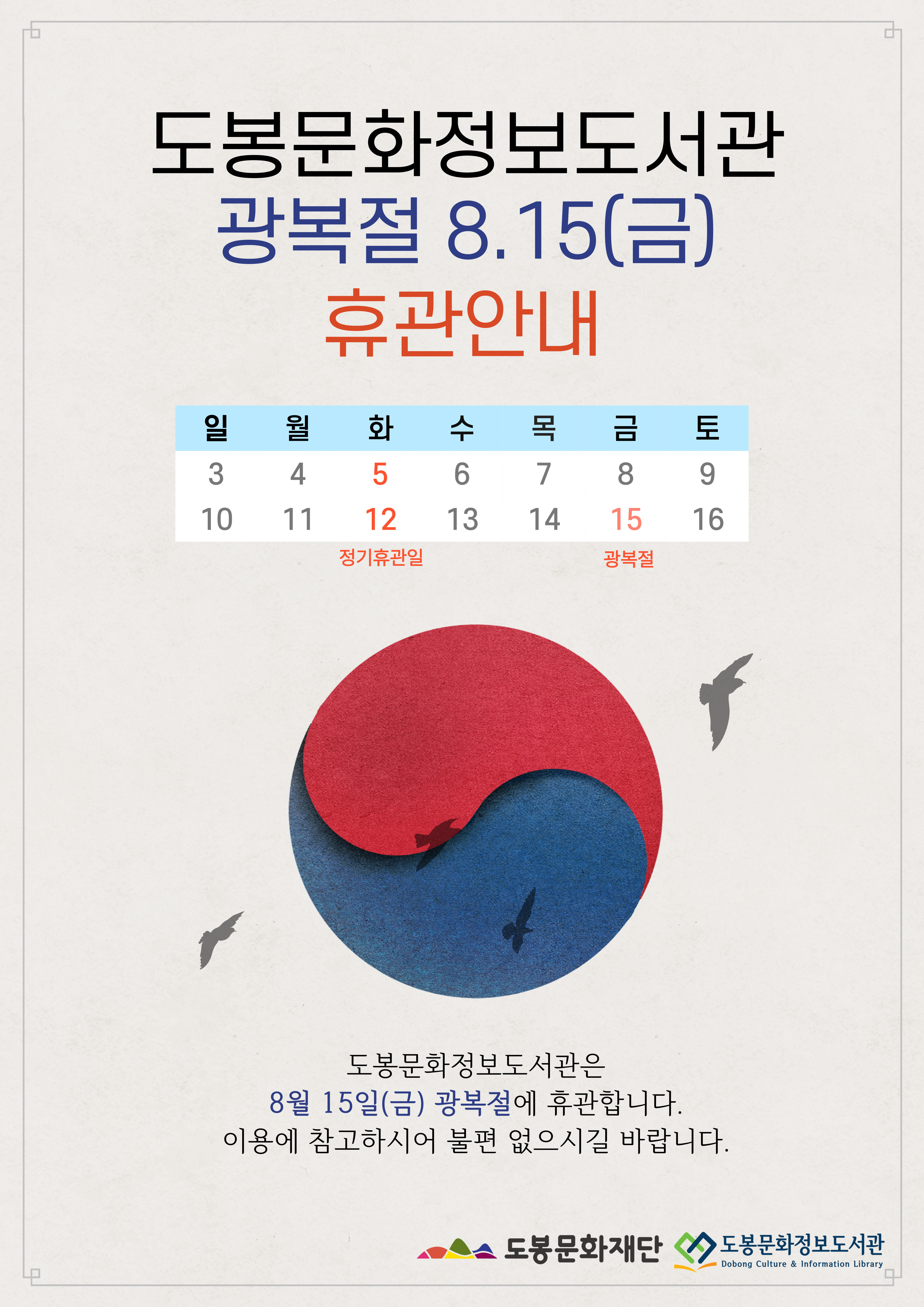 도봉문화정보도서관은 8월 15일 (금) 광복절에 휴관합니다. 이용에 참고하시어 불편 없으시길 바랍니다.