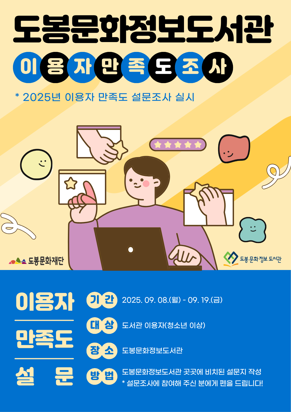 도봉문화정보도서관에서 더 나은 서비스를 제공하고자 2025년 이용자 만족도 조사를 실시합니다.
