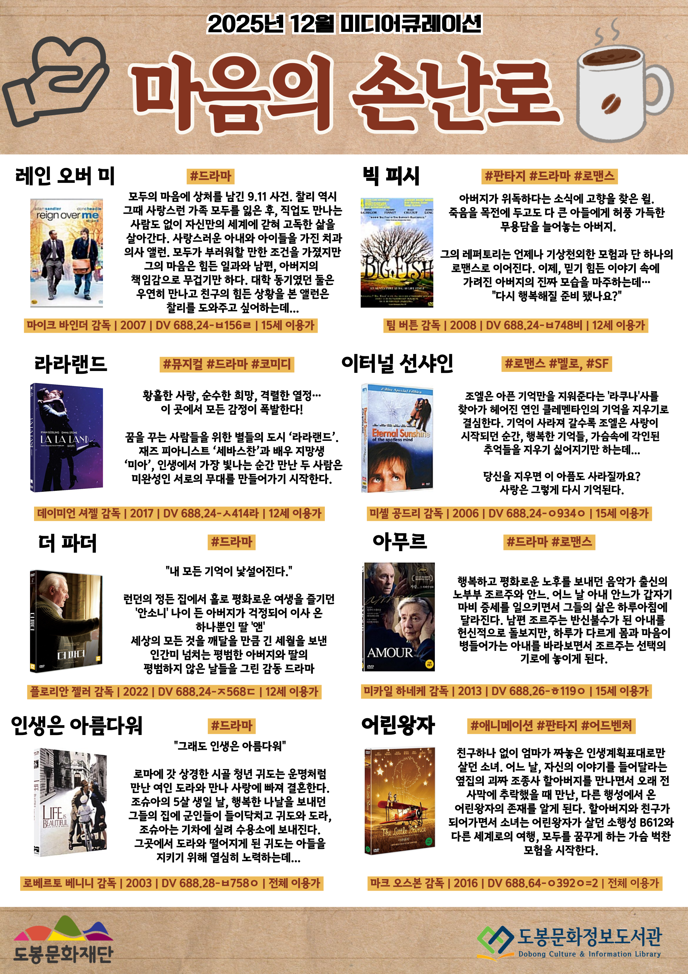 12월 멀티미디어실 미디어큐레이션 주제는 [추운 겨울을 녹이는 따뜻한 드라마 영화] 입니다. 많은 이용 부탁드립니다.