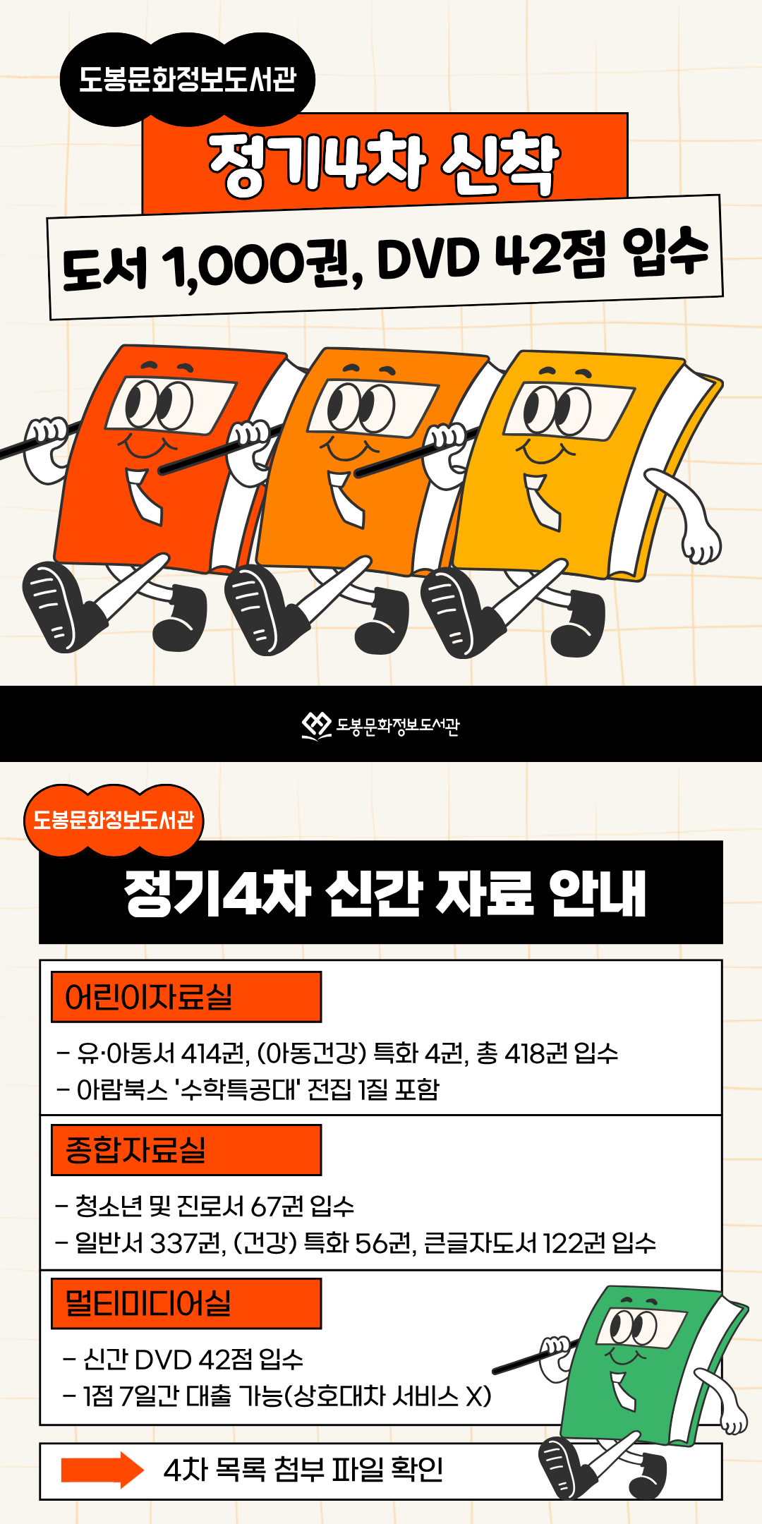 도봉문화정보도서관 2025년 정기4차 신간도서 1,000권과 DVD 42점이 입수되었습니다.