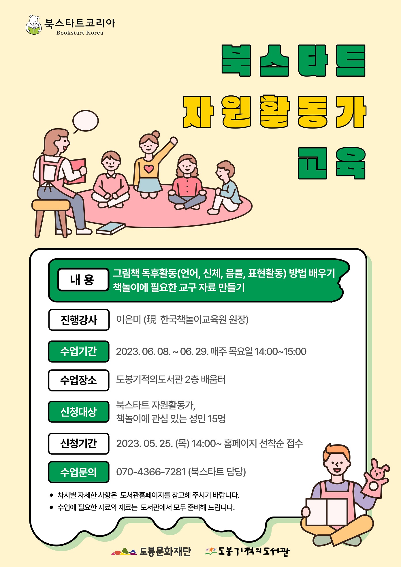 도봉구 북스타트 자원활동가 및 책놀이에 관심있는 성인분들 이라면 누구나 신청가능 하십니다.