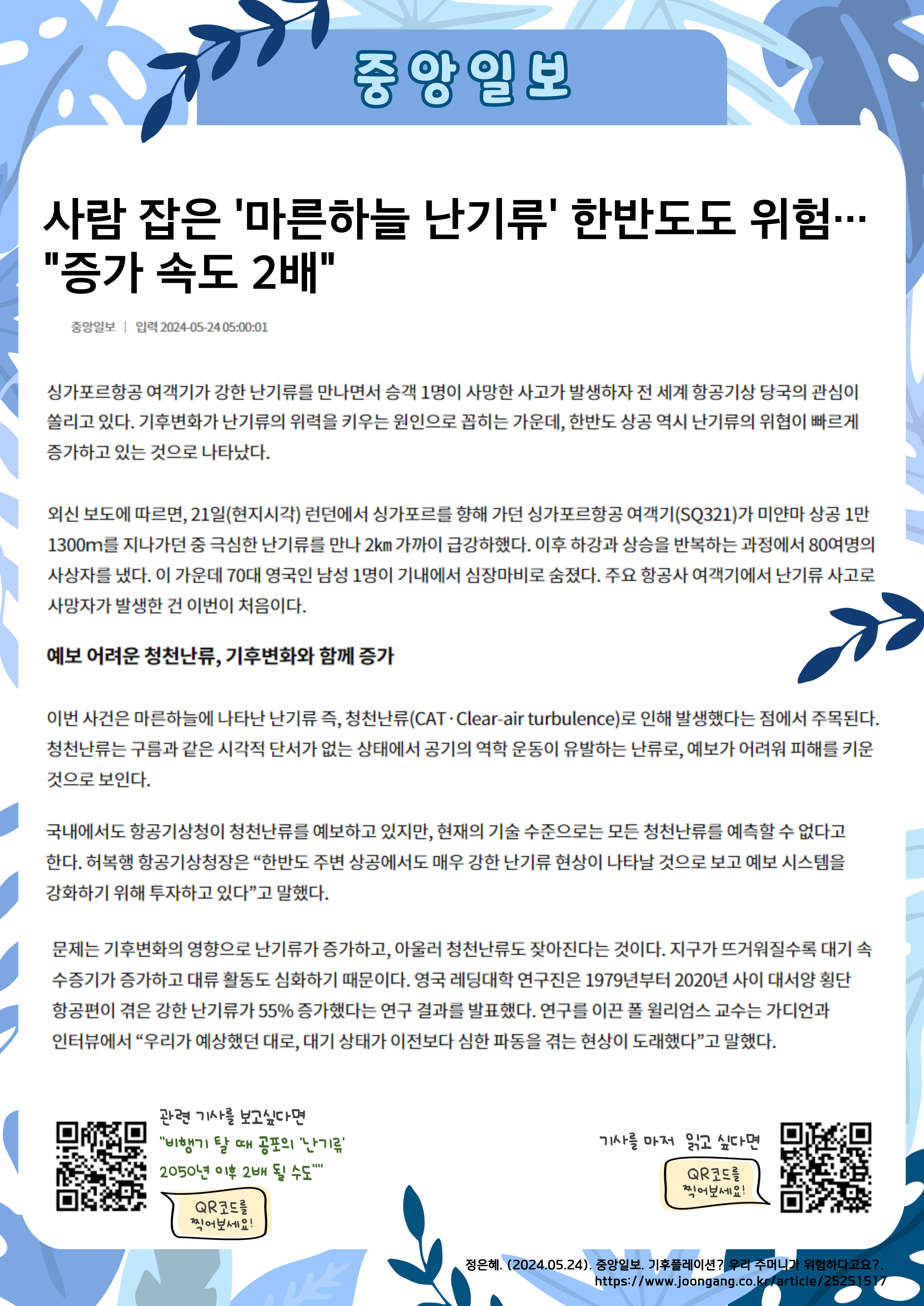 사람 잡은 '마른하늘 난기류' 한반도도 위험…"증가 속도 2배"