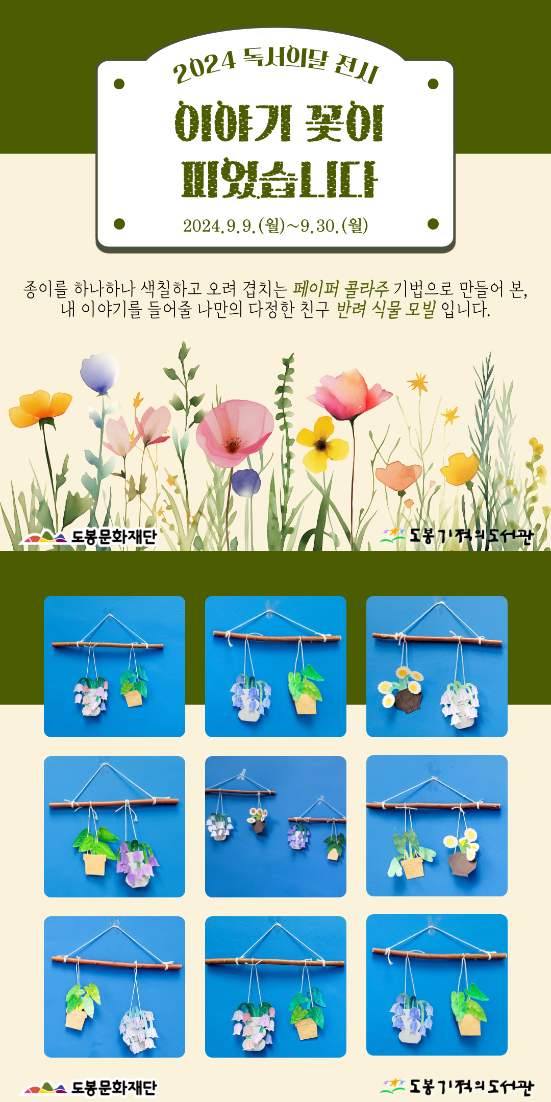 도봉기적의도서관 독서의 달 체험 '이야기 꽃이 피었습니다' 결과물을 전시하고 있습니다.