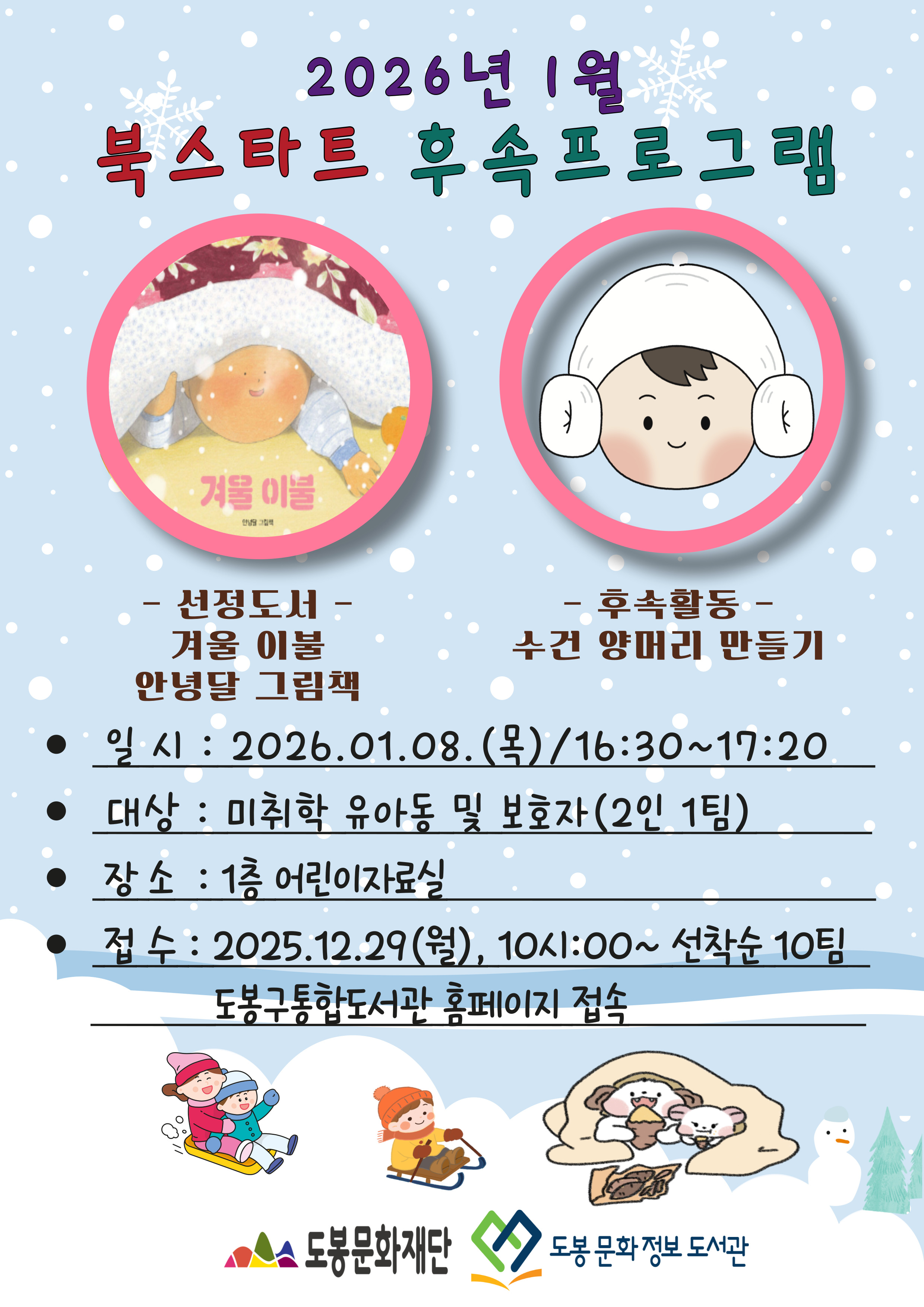 - 다음 2026년 1월 넷째주 북스타트 후속프로그램 접수는 1월 12일(월) 10시 입니다.