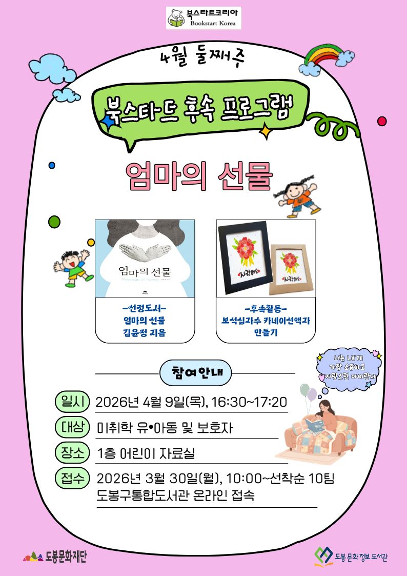 - 다음 2026년 4월 넷째주 북스타트 후속프로그램 접수는 4월 13일(월) 10시 입니다.
