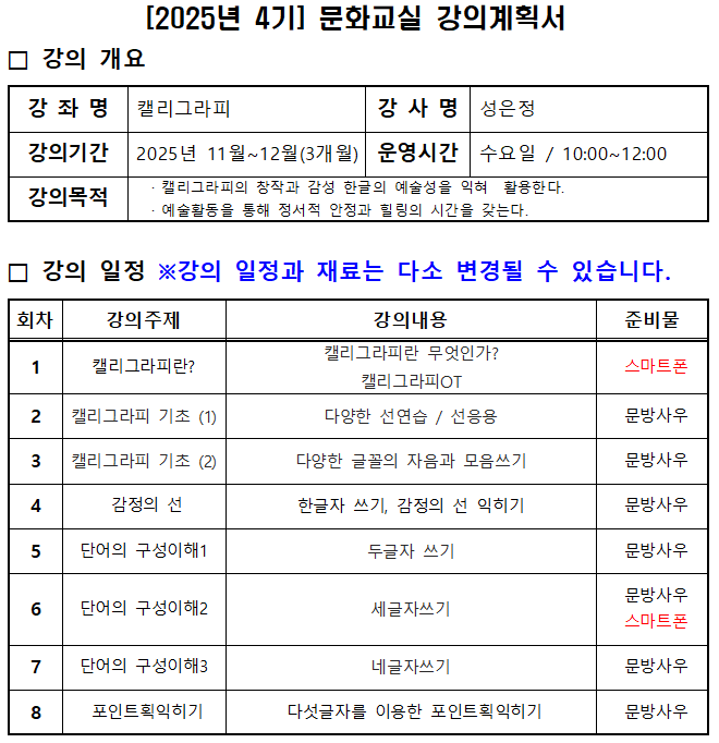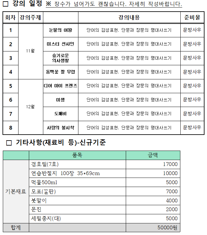 1. 월 4회 수업입니다. (회차가 줄어들 시 보충 강의 실시)