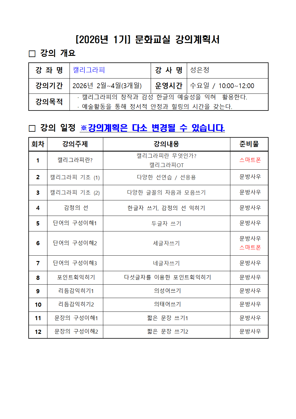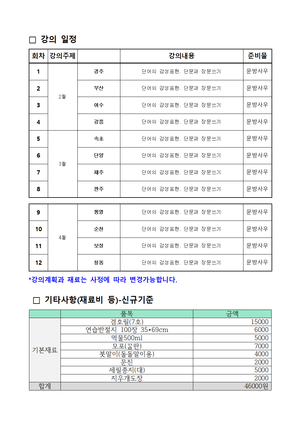 1. 월 4회 수업입니다. (회차가 줄어들 시 보충 강의 실시)